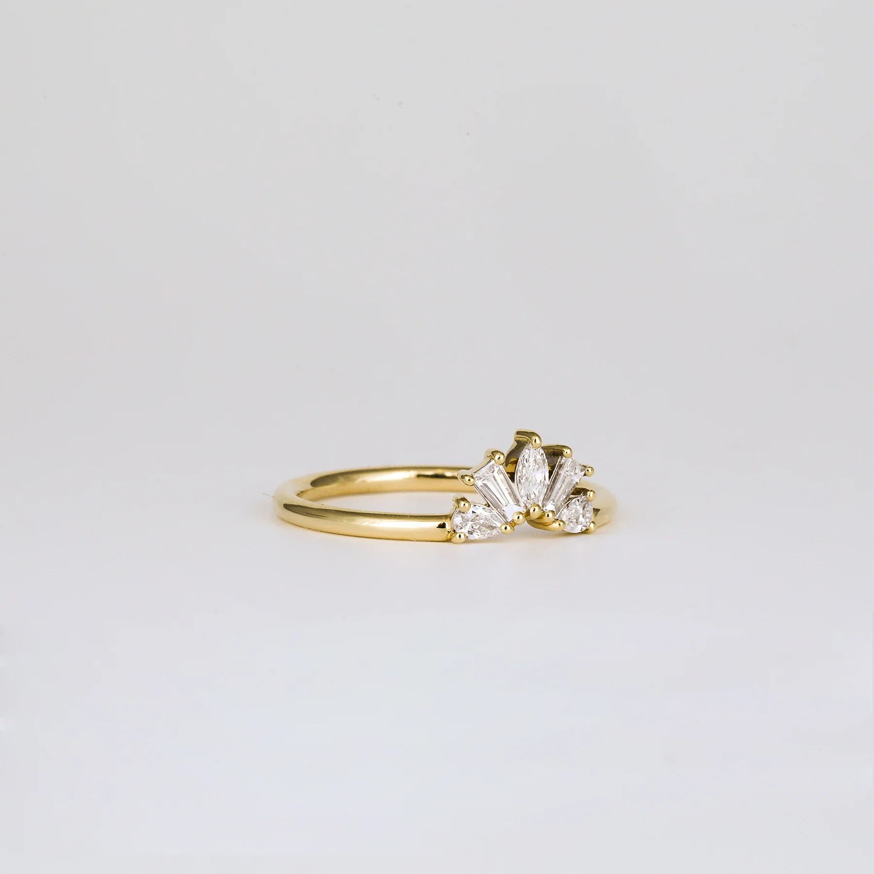 White diamond pear, tapered baguette, marquise cuts. Set in a Grew & Co signature band.