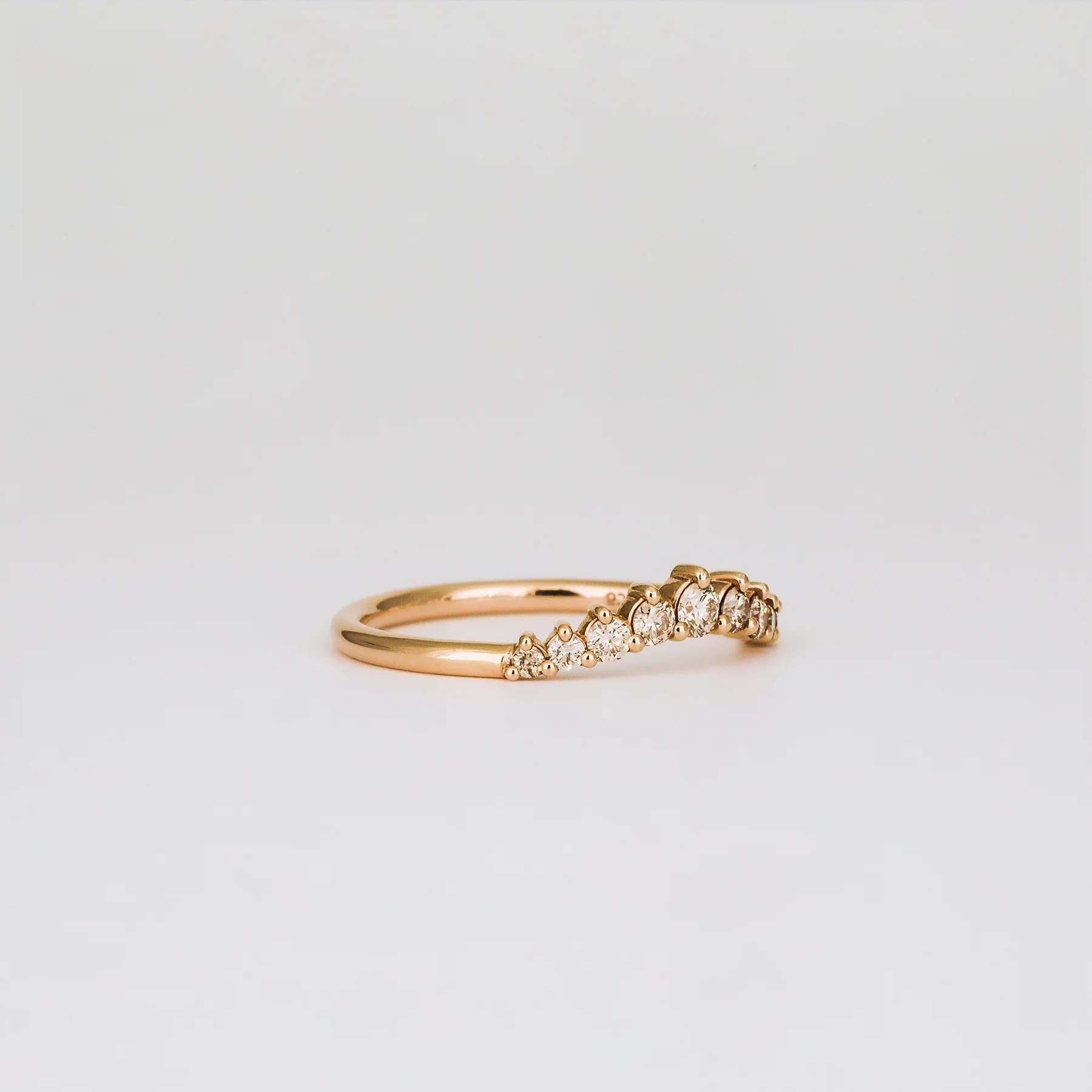 A curved band featuring brilliant cut champagne diamonds in graduating sizes, set in three claws on a Grew & Co signature band.