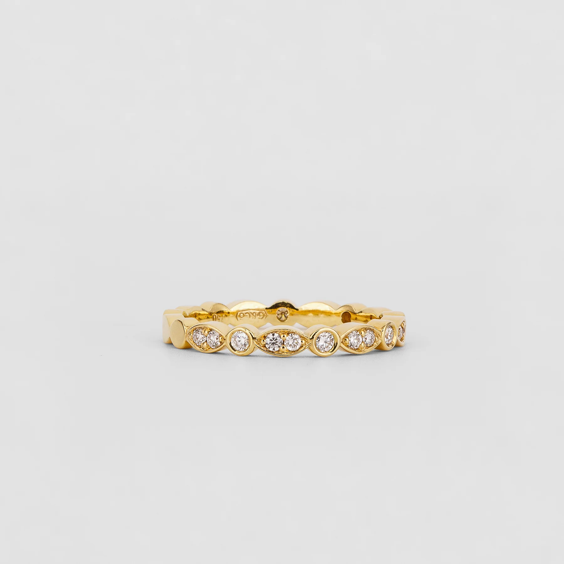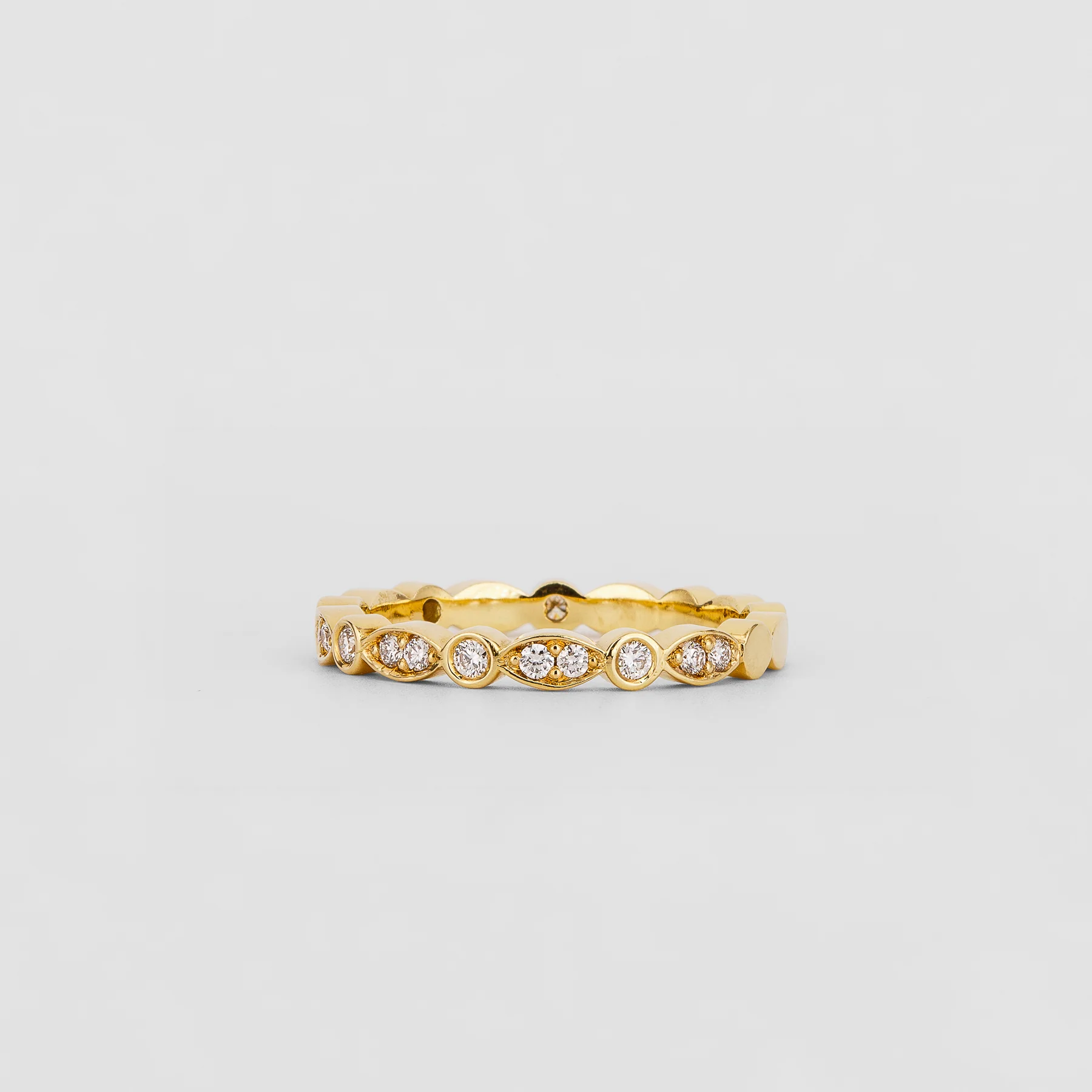 A 18k yellow gold eternity band with alternating marquise and round settings, each cradling round brilliant diamonds in a rhythmic, wave-like flow. Sculptural and graceful, this piece captures the beauty of movement and enduring love.