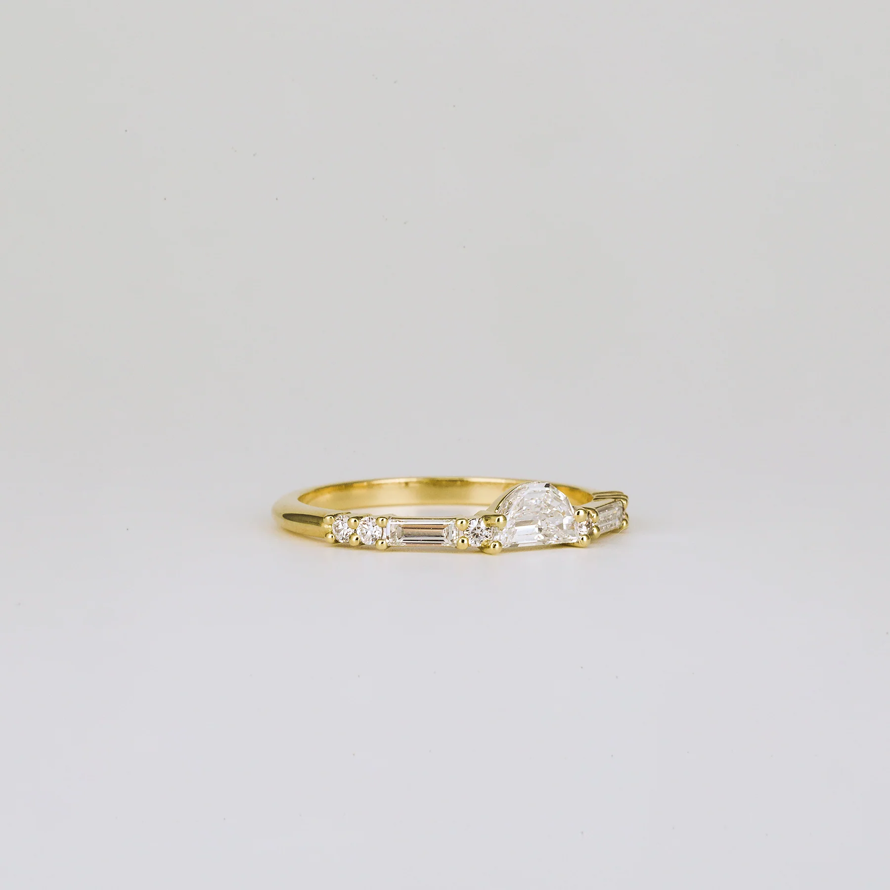 Understated beauty, featuring custom cut half-moon diamond in the centre, framed by round brilliant cut diamonds and custom cut baguette to complete this amazing look.Â