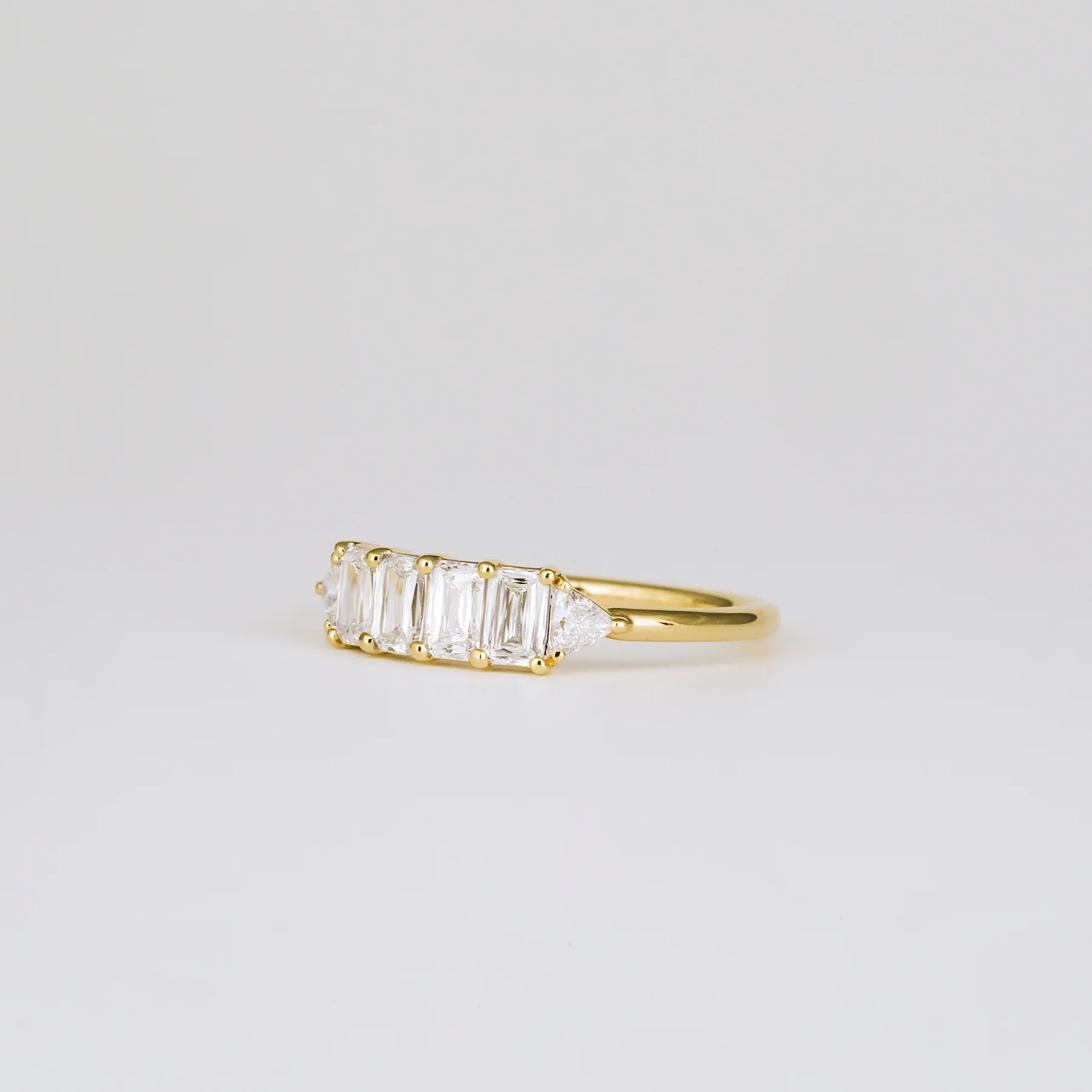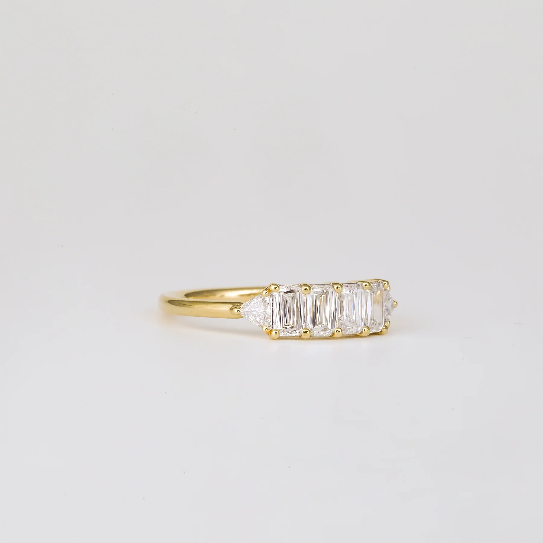 Four white diamond triple cuts, framed by a pair of trillion cuts. Set in 18k yellow gold in a signature Grew & Co band.Â