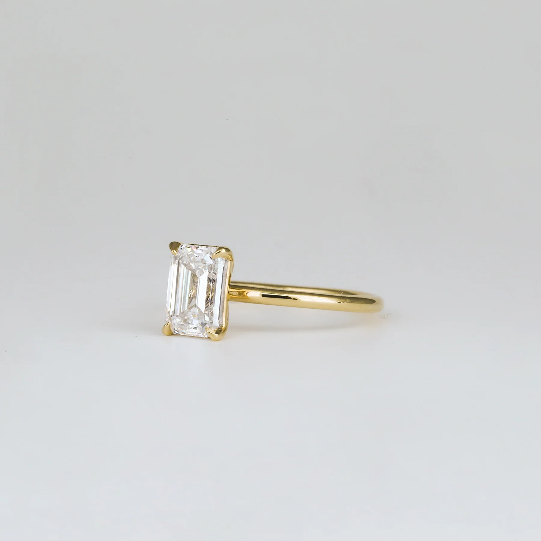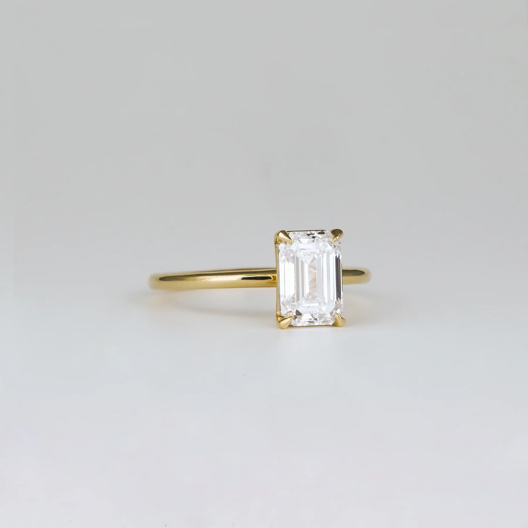 An emerald cut lab grown diamond, set in an 18k yellow gold solitaire setting, on a signature Grew & Co band.